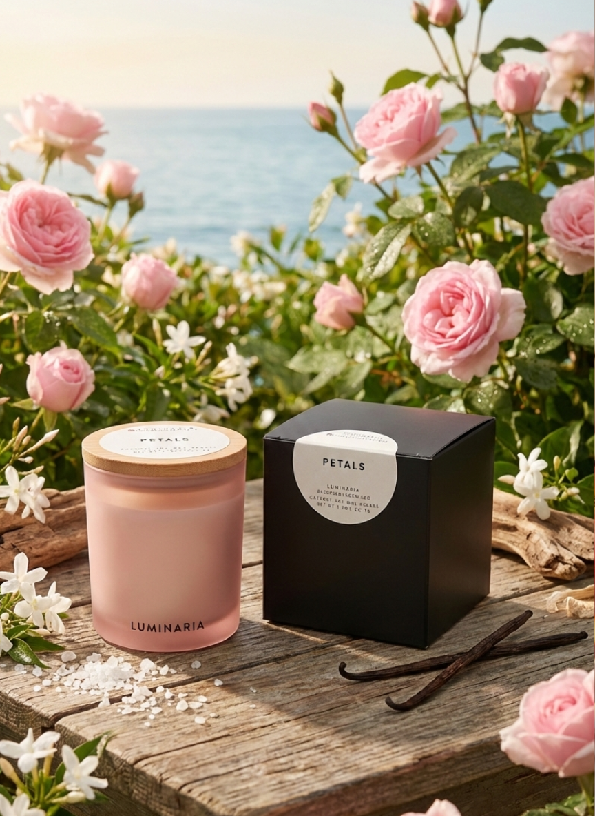 A luminous floral-marine blend that feels like fresh petals carried on a soft coastal breeze. Velvety rose and delicate jasmine float over airy sea salt and dewy greens, grounded by warm vanilla, driftwood, and sheer musk. Clean, elegant, and irresistibly feminine.